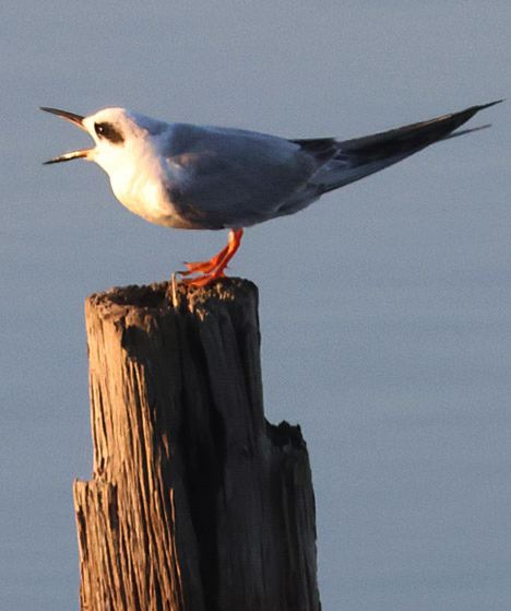 The Forster's Tern at the right perched on one of the old pilings below the observation platform until two more terns flew over low. In the photo, it is reacting to them coming too close. After they left, it waited a minute or two and then departed.