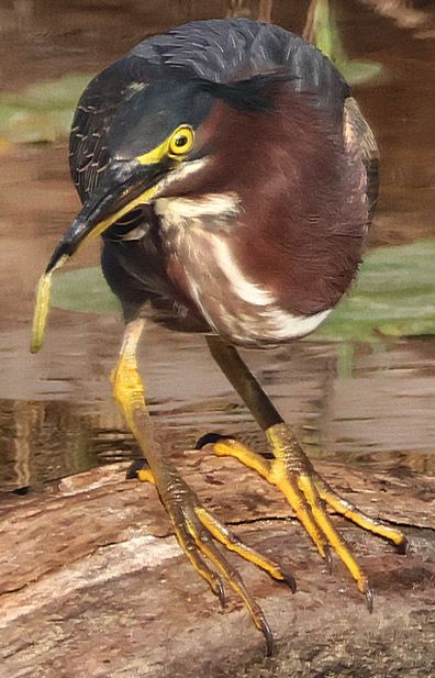 The Green Heron was perched on a stump just protruding toward the center of the canal. It was stationary for quite a while before slowly dipping down, stretching its neck as far as it would go, and snagging what appears to be a caterpillar from one of the Spadderdock leaves floating in the canal.